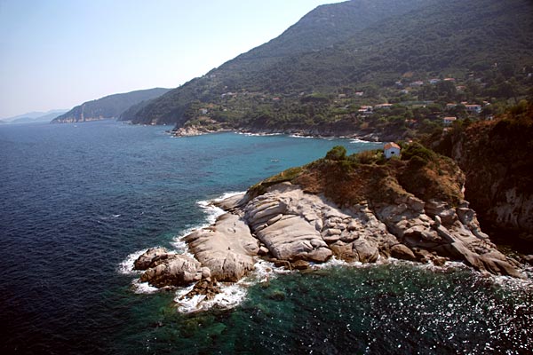 Le Cote Piane, the giant cliffs on the left hand side of the beach in Sant'Andrea, consist of massive blocks of granodioritic rocks that plunge right down to the sea, and are covered in oceanic Posidonia and sea sponges.